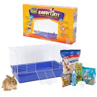 The ultimate starter kit for rabbits. Quality construction features chew proof coated wire and stain resistant plastic parts. Everything is included: home, bedding, food, treats, toys, water bottle and food dish. E-z assembly with snap together setup, no tools needed. Free care sheet in every kit.